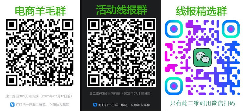 🍭 使用钉钉APP搜索群号: 103050000116 进钉钉群,或用钉钉扫描下面二维码(图3是微信线报推送机器人),不用翻墙看实时线报!支持搜索指定关键词内容!活动链接可以直接打开!